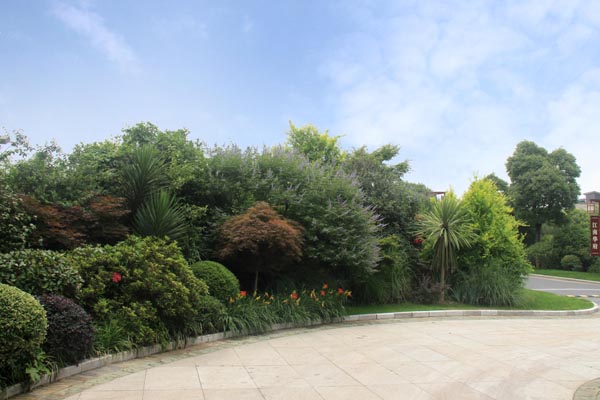 別墅小區(qū)公共景觀的植物配置不但要與建筑、環(huán)境相協(xié)調(diào),還要做到多層次、多樣化、多季相,并創(chuàng)造出植被生態(tài)景觀及其圍合空間的豐富多彩,達(dá)到人與環(huán)境的和諧統(tǒng)一,因此,植物的選擇與配置顯得尤為重要。據(jù)徐建良介紹,工程中的植物選擇與配置遵循三個(gè)原則:第一,根據(jù)地域特征,考慮季相變化;第二,根據(jù)建筑空間的大小、遠(yuǎn)近,近景或端景配置觀賞性強(qiáng)的品種,遠(yuǎn)景的植物配置則充分考慮空間天際線及建筑物之間的關(guān)系;第三,充分考慮林下植物和孤賞植物布置的各個(gè)方面,突出自然生長特征和人工修整造型植物之間的反差對比。以此為指導(dǎo),上層空間選擇了香樟、合歡、玉蘭、樸樹、銀杏等大規(guī)格喬木,中下層空間種植紅葉石楠、枸骨、杜鵑、鋪地柏、火棘等花灌木和地被,再配以微地形的處理,整個(gè)植物造景的林冠線、林緣線及空間層次別具特色,從而使得別墅區(qū)的整體景觀層次分明、色彩豐富,既在統(tǒng)一中富于變化,每個(gè)區(qū)域又自成風(fēng)格。特別是每個(gè)路口的花境營造,更為小區(qū)增添一抹亮色。
